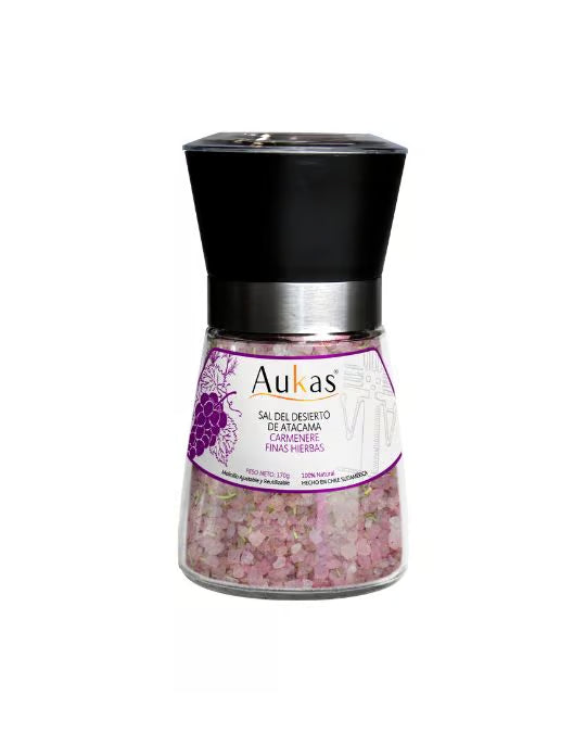 Ingredientes: Sal, concentrado de vino carmenere, tomillo, romero, ciboulette, eneldo, y yodato de potasio. 100% Natural, sin aditivos, sin preservantes y sin MSG.